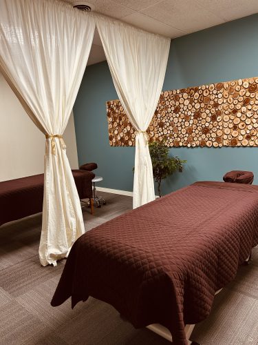 Picture of our Couples Suite, complete with 2 cushy massage tables with luxury linens, and a space to enjoy complimentary beverages after your services.